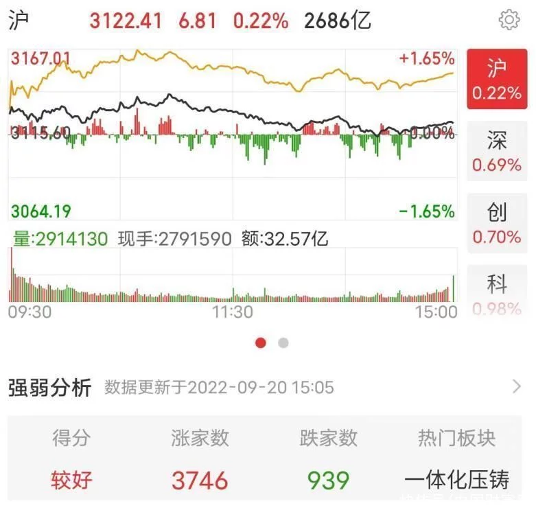 我们来看看大盘情况,今日大盘高开后震荡上升,随后冲高回落,沪指盘中一度翻绿。截至收盘,三大指数均小幅上升,沪指涨0.22%,深成指涨0.69%,创业板指涨0.7%。