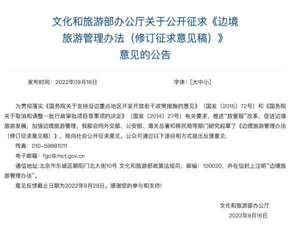 据了解,《边境旅游暂行管理办法》自1997年实施以来,在吸引人口集聚、加强基础设施建设、推动边境旅游便利化,促进边疆地区与周边国家的人文交流和共同发展等方面发挥了重要作用,对于深化改革、扩大开放、兴边富民、推动经济稳增长具有重要的意义。此次修订征求意见稿共二十六条,涉及细化边境旅游合作协议相关规定、明确边境社的审批条件和程序等方面。
