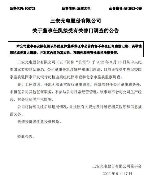 针对这则传闻,三安光电工作人员回应称,该传闻为假消息。此前三安光电就发布《关于董事任凯接受有关部门调查》的公告。