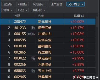 今日赛道股全线反攻,集体回调,TOPCON电池涨幅居前,钧达股份涨停,光伏、储能、锂电、HJT电池等赛道卷土重来,新元科技20CM大长腿,昆工科技涨逾18%,盛帮股份、川能动力、宝塔实业、兆新股份等多股涨停,天齐锂业涨超8%,盛新锂能盘中涨超7%。