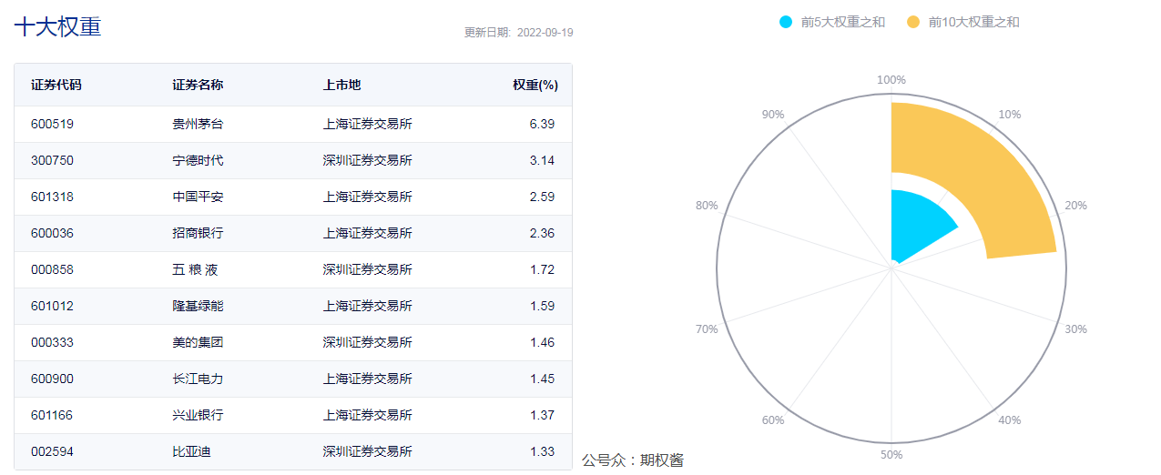 沪深300只成分股的权重数据,权重最大的是贵州茅台,权重为6.39%,宁德时代、中国平安、招商银行、五粮液、隆基绿能、美的集团、长江电力、兴业银行、比亚迪十大权重股。