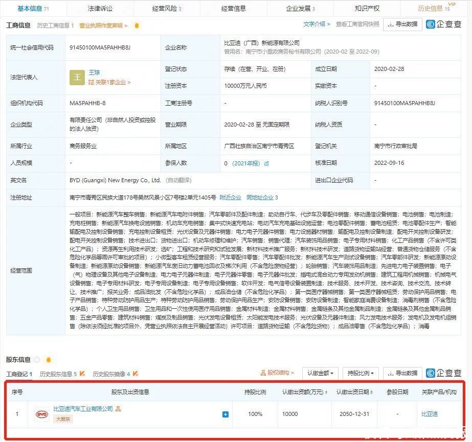 另外,比亚迪(广西)新能源有限公司的经营范围新增电池制造、充电桩销售、新能源汽车换电设施销售、机动车充电销售、集中式快速充电站等。企查查相关信息显示,该公司成立于2020年,现法定代表人为王琼。