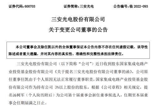 9月18日盘后,三安光电发布公告称,近日收到股东国家集成电路产业投资基金股份有限公司(以下简称大基金)《关于提名三安光电股份有限公司董事的函》,公司原任董事任凯由于个人原因无法正常履行董事职责,大基金作为持有公司 3%以上股份的股东,根据《公司章程》相关规定,提名汤树军为公司第十届董事会新任董事候选人,任期至本届董事会任期届满之日止。