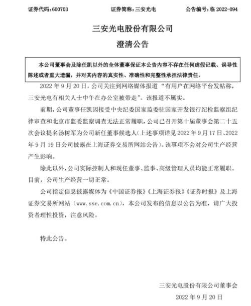 此后,三安光电进一步发布澄清公告,针对三安光电有相关人士中午在办公室被带走的传闻,公告称,该报道不属实。