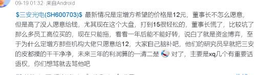 值得注意的是,三安光电最新价格19.51元,12元的定增目标价意味着还要在此基础上打6.15折,这会严重损害现有股东利益。
