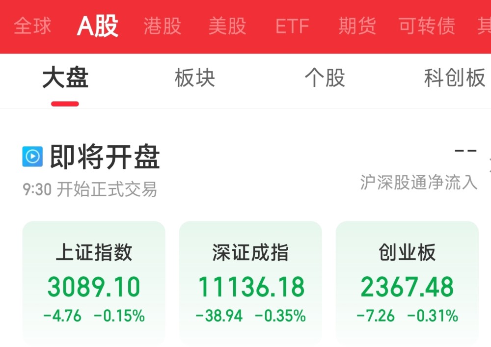 中新经纬9月28日电 28日(周三),A股三大指数集体低开。上证指数开盘跌0.15%,报3089.10点;深证成指跌0.35%,报11136.18点;创业板指跌0.31%,报2367.48点。沪深两市所有交易个股涨跌比为1298:2665,两市涨停8家,跌停5家。