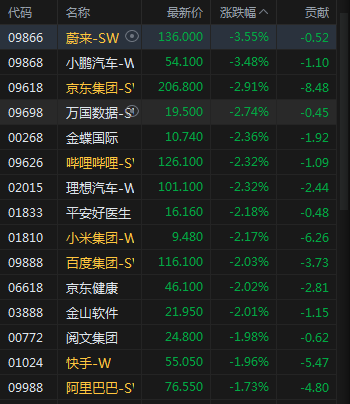 恒生科技指数跌1.46%,蔚来跌3.55%,小鹏汽车跌3.48%,京东跌2.91%。