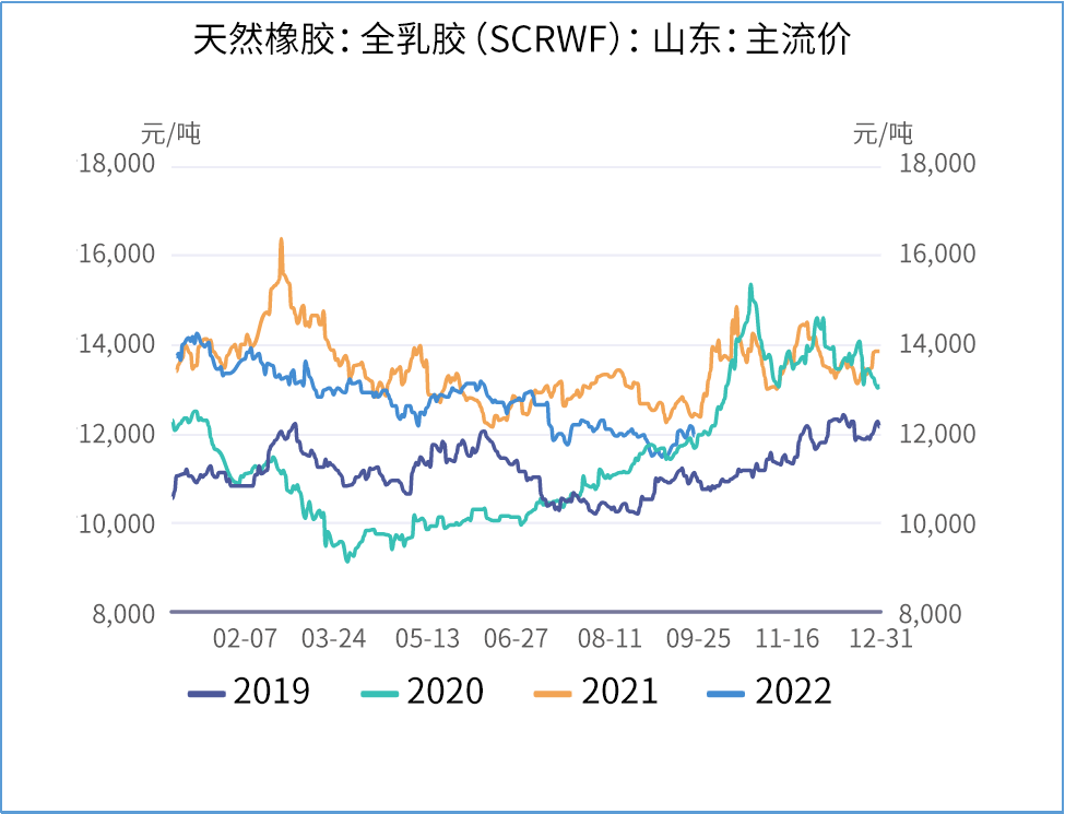 库存方面,截止到9月23日,上海期货交易所的天然橡胶仓单量约为26.2万吨,仓单量在9月合约进入交割后,仅温和增长。总仓单水平较之2021年同期高出约7万吨,但较2019年的仓单规模依然偏低。现货胶报价方面,截止9月23日,山东地区云南全乳胶报价在11950元/吨,2301合约较之现货升水已恢复至1000元/吨以上水平。