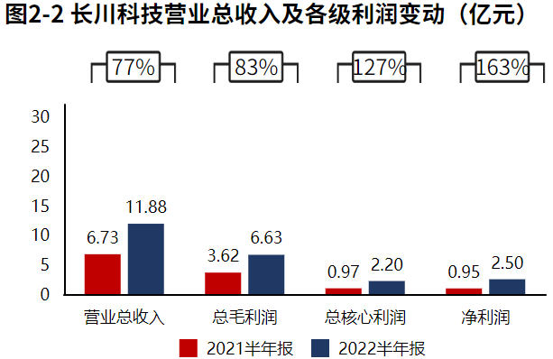 公司业绩大幅增长。2022半年报长川科技营业总收入11.88亿元,同比增速77%,毛利润6.63亿元,同比增速83%,核心利润2.20亿元,同比增速127%,净利润2.50亿元,同比增速163%。