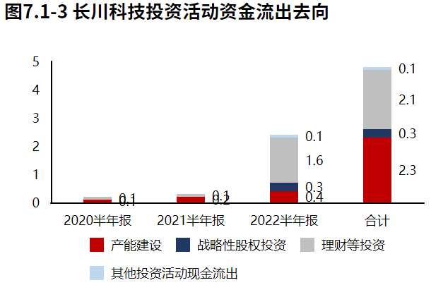 投资流出快速增加,主要流向了理财等投资,其次是产能建设。长川科技2022半年报的投资活动资金流出,理财等投资占比最大,占比66.67%。长川科技2020年报到本期的投资活动资金流出,产能建设占比最大,占比48.35%,此外理财等投资也占比较大。