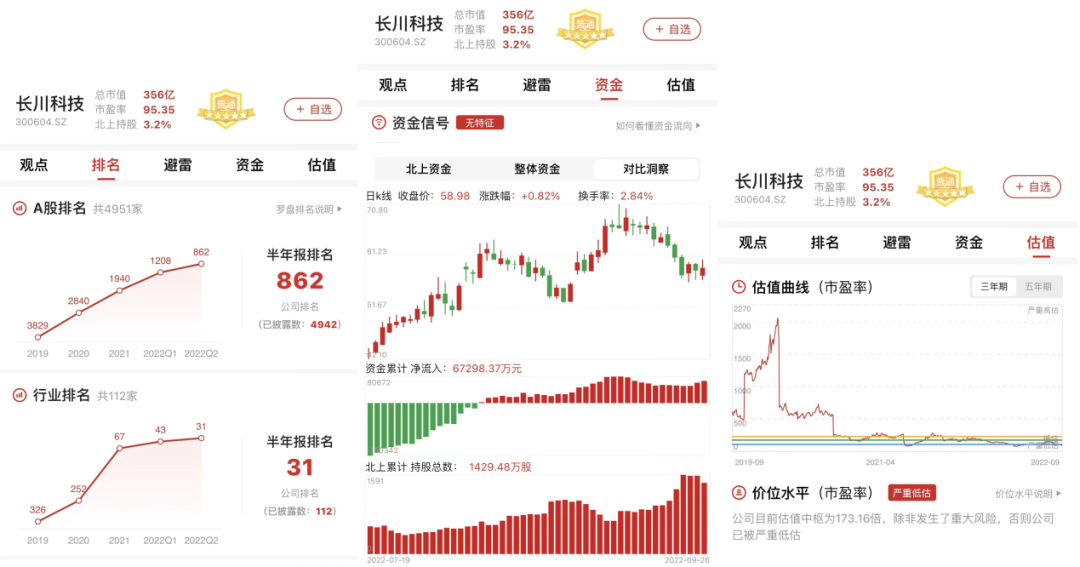 截至2022Q2,长川科技在A股的整体排名上升至第862位,在半导体行业中的排名上升至第31位。截止2022年9月26日,北上资金并无特别信号。以近三年市盈率为评价指标看,长川科技估值曲线处在严重低估区间。