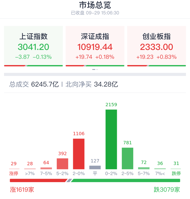 在央行的利好提振下,9月29日,A股三大指数高开,创业板一度涨2%。但由于市场抛盘过大,指数冲高回落,沪指下跌0.13%,最低跌至3026.08点,创出本轮调整新低;深市上涨0.18%;创业板指上涨0.83%;科创50指数上涨0.55%。两市成交近6300亿元。