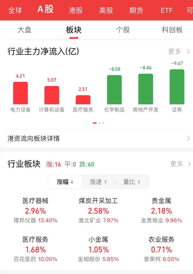 从盘面上看,周四煤飞色舞行情再现,煤炭、有色、能源三大周期板块稳居涨幅榜前列,房地产服务概念股、景点及旅游概念股、物业管理概念股领跌。从板块上看,医疗器械、煤炭、贵金属板块涨幅前三,不过两市仅有5个行业涨幅超过1%、16个行业收红,房地产服务、景点、酒店板块跌幅前三,前期强势股出现大幅杀跌。两市有27个行业跌幅超过1%,板块整体表现不佳。焦点股方面,美芝股份午后开盘直线跳水触及跌停,上演天地板,截至收盘,成交金额3.18亿元。电热毯龙头彩虹集团再度涨停,走出7天5板;燃气股德龙汇能走出涨停两连板。