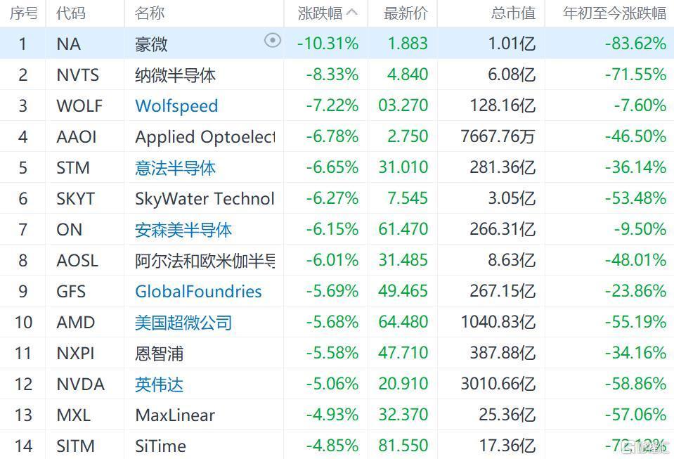 格隆汇9月29日丨美股半导体股普跌,纳微半导体跌8%,Wolfspeed跌7%,意法半导体、安森美半导体跌6%,GFS、AMD、英伟达跌5%。美银此前因担心消费者需求减弱而下调了苹果的评级,现在将未来三个季度iPhone销量的预期下调了5%至10%。因此,这可能会对每年10%至15%的半导体需求造成冲击,并影响大片芯片市场,以及台积电和GlobalFoundries等代工企业,以及半导体设备和测试工具工厂。