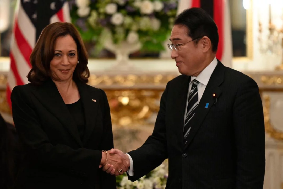 2022年9月26日,在日本东京赤坂宫国宾馆举行的日美双边会议上,美国副总统卡玛拉·哈里斯和日本首相岸田文雄握手▼