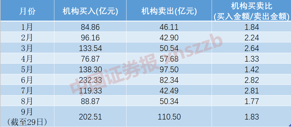 中国证券报记者梳理分析数据发现,9月A股大宗交易热情高涨,机构资金功不可没。机构正通过大宗交易大举买入A股,9月机构席位通过大宗交易买入202.51亿元,暂居全年月度机构买入金额第二位。