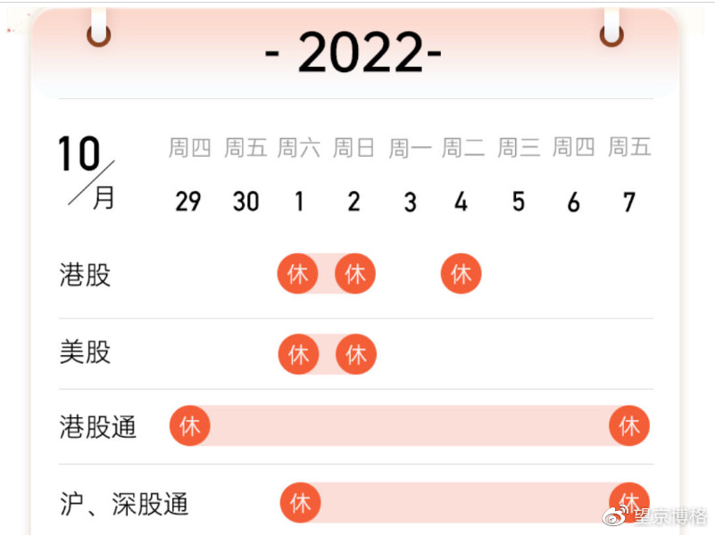 还有一个是买港股的方式,是通过开设港股通借道买港股的,则是9月29日至10月9日都休市,10月10日才能恢复交易(和a股开市时间一样)。
