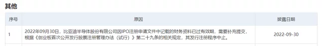 鞭牛士 9月30日消息,深交所网站显示,2022年09月30日,比亚迪半导体股份有限公司因IPO注册申请文件中记载的财务资料已过有效期,需要补充提交,根据《创业板首次公开发行股票注册管理办法(试行)》第二十九条的相关规定,其发行注册程序中止。