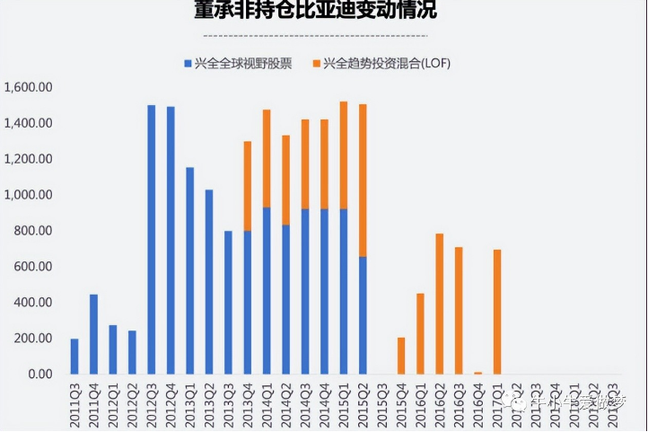 2011年,前兴全基金经理董承非就加仓了比亚迪,也是最早重仓该股的公募。