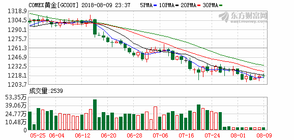 周一(8月6日),现货黄金价格在美元指数走坚的背景下重新转跌。英镑兑美元周一创下近11个月以来新低,因有英国官员表态称,欧盟毫不妥协正把英国推向无协议脱欧。 截至发稿,现货黄金下跌0.58%至每盎司1207.85美元,亚洲时段一度上涨近0.3%;COMEX期金主力合约下跌0.6%至1215.9美元/盎司;美元指数上浮0.29%至95.456,盘中创7月19日以来新高95.515。英镑兑美元暴跌0.61%至1.2923,盘中创去年9月5日以来新低至1.2917。 市场为美国公债收益率进一步上涨做出准