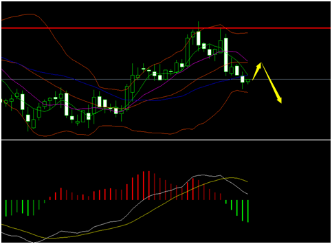 行情分析:美指日线连续两日尝试突破95.6关口未果,昨日收小阴线最低触及95一线。今日早间开盘,美指一度跌破95支撑,表明95一线支撑岌岌可危。四小时MACD双线交死叉下行,双线开口扩张,绿色动能柱放量。Boll带中轨向下开口,行情运行于Boll下轨附近,同时均线指标拐头向下,意味着盘中空头集聚。后市建议高空为主。