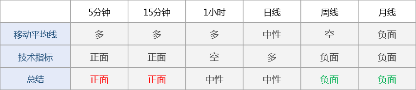 多周期技术信号显示日内市场情绪看涨:短线看涨(5分钟,15分钟,1小时),中线中性(日线),长线看跌(周线,月线)。