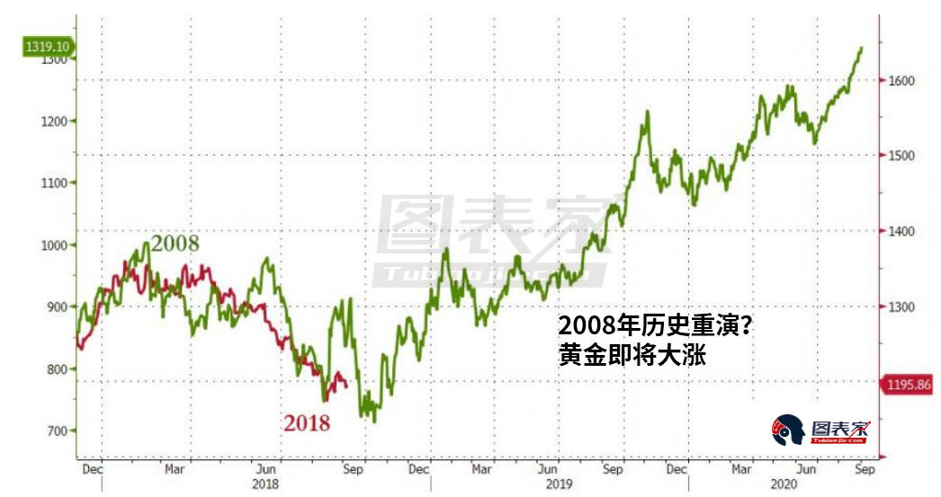 2008年金融危机爆发后,市场陷入恐慌,甚至连黄金白银(通常被认为金融危机的对冲工具)也在和其他所有资产一起暴跌,黄金价格在2008年8月下跌了近20%: