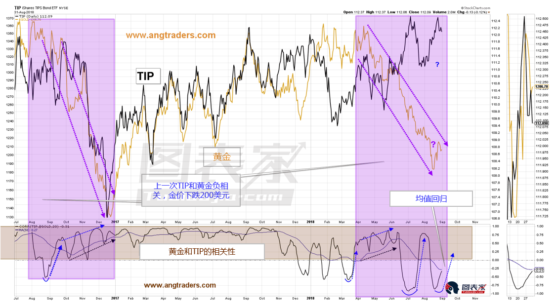 本周,TIP和黄金的相关性开始出现均值回归。TIP可能延续从近期低点回落的跌势,随着相关性回归均值,黄金可能随着TIP走低。