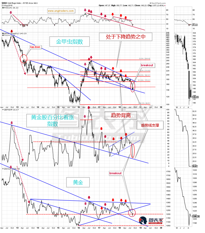 金甲虫指数和黄金股百分比看涨指数均测试下降趋势线支撑,黄金处于1200关键位置附近。金甲虫指数的RSI指标处于超卖区域,这一意味着黄金股可能继续上涨,但是上涨空间可能受限于较高的下降趋势线。