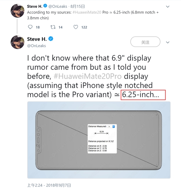 9月7日晚间,知名爆料人士@Onleaks放出了华为Mate 20 Pro CAD设计图。Onleaks透露华为Mate 20 Pro的屏幕尺寸为6.25英寸(之前传闻Mate 20 Pro屏幕尺寸为6.9英寸),其下巴为3.8mm,刘海宽度为6.8mm。