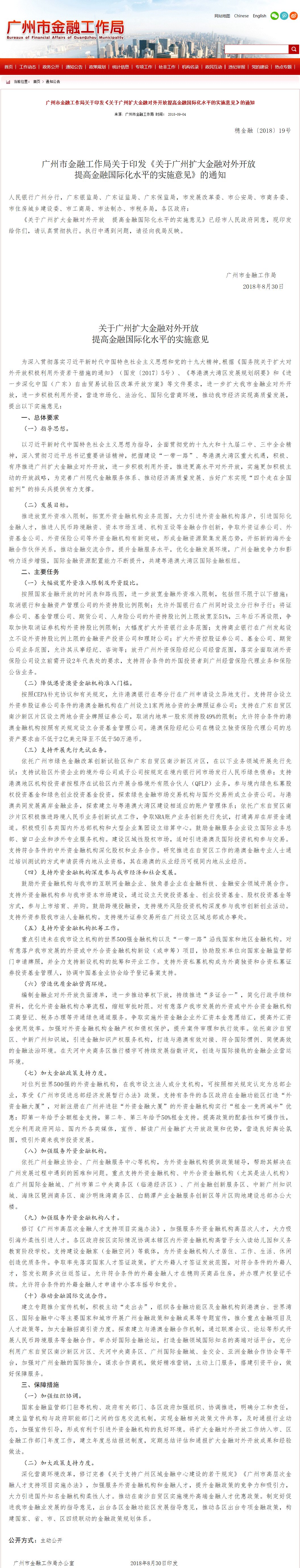 6月21日上午,在2018年“广州金融”发布会上,广州市金融工作局局长邱亿通透露,广州市已经拟定扩大金融对外开放提高金融国际化水平的10条政策措施。不到3个月,10条政策措施正式落地。