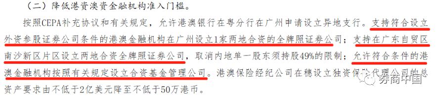 同时,支持符合设立外资参股证券公司条件的港澳金融机构在广州设立1家两地合资的全牌照证券公司;支持在广东自贸区南沙新区片区设立两地合资全牌照证券公司。允许符合条件的港澳金融机构按照有关规定设立合资基金管理公司。